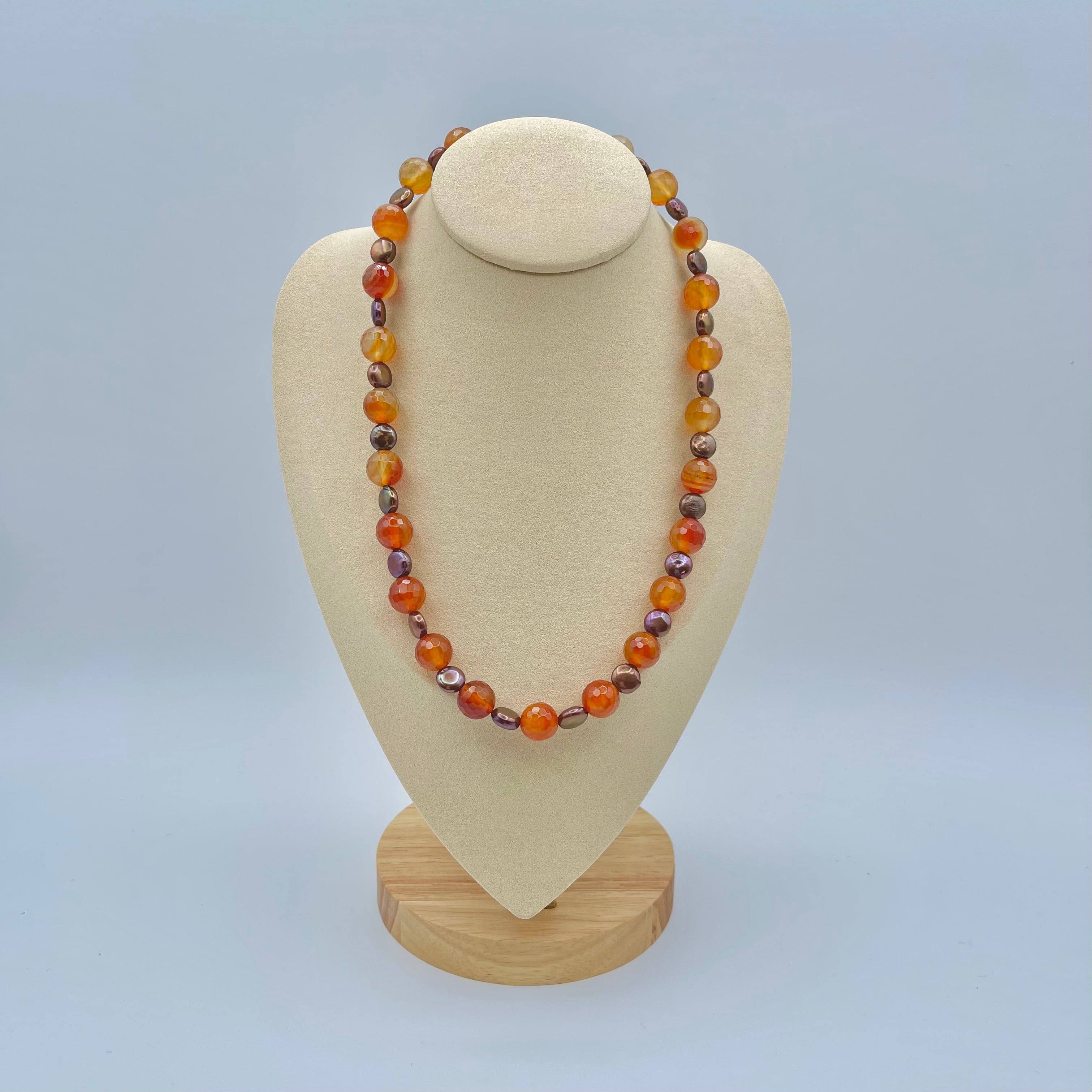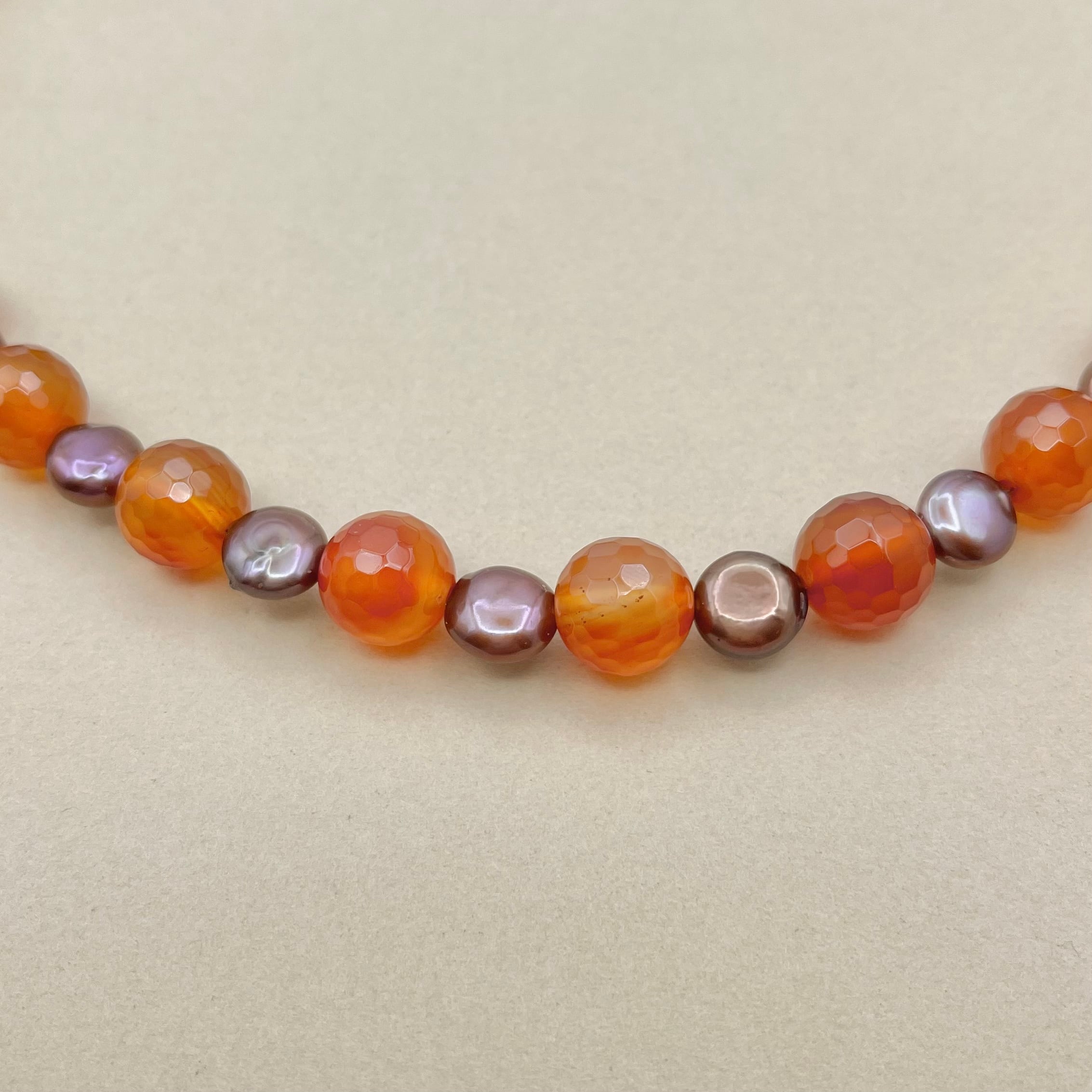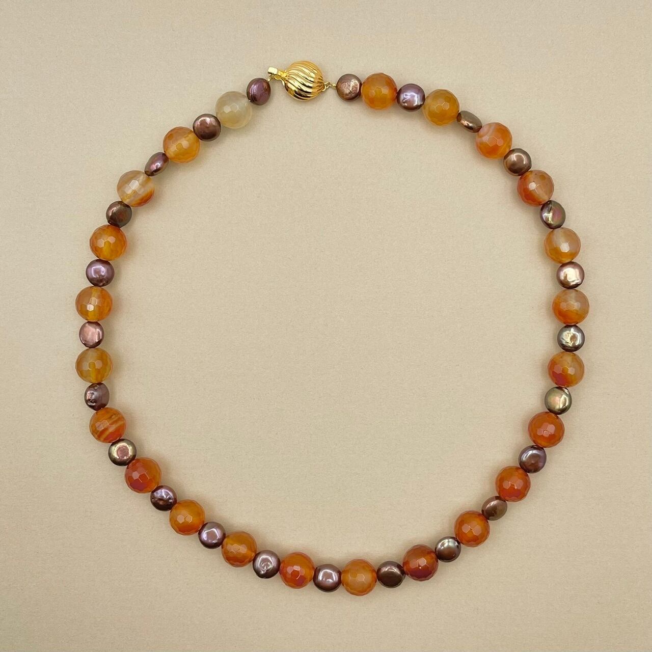 暖かみのあるオレンジ色のカーネリアンと上品さを引き立てるヴィンテージゴールドのパールの組み合わせが、モダンでありながらもエレガントな印象を与えるネックレスです。華やかな装いにもシンプルなコーディネートにもマッチしますので、特別な日や大切な場面だけでなく普段使いにもおすすめです。