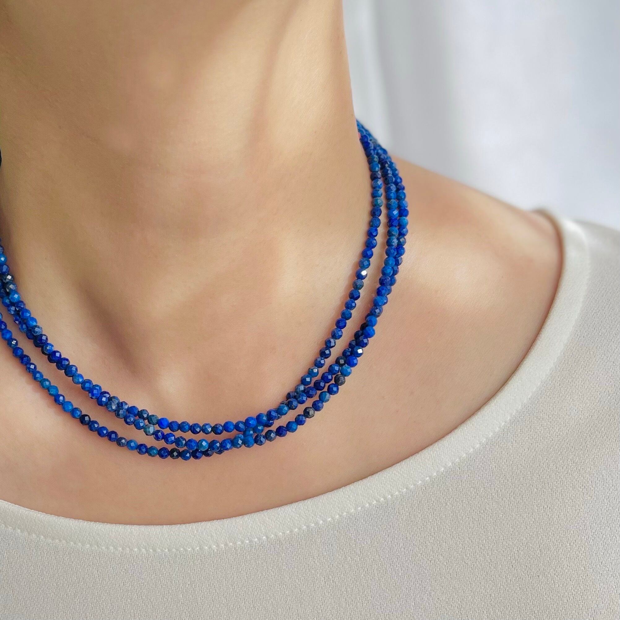 深い青色が美しい気品あるロイヤルブルーのラピスラズリを贅沢にあしらった3連のネックレスです。一粒一粒丁寧にカットされたストーンは、光を受けると深い輝きを放ちます。また、ラピスラズリの深い色合いが優雅さを引き立て、クラシカルな雰囲気を醸し出します。シンプルなデザインながらも存在感があり、どんなシーンにもマッチします。ラピスラズリは古代エジプトやローマ時代から珍重されてきた宝石で、自己表現や内なる力を高めると言われていますので、特別な日や大切な人への贈り物にも最適です。
