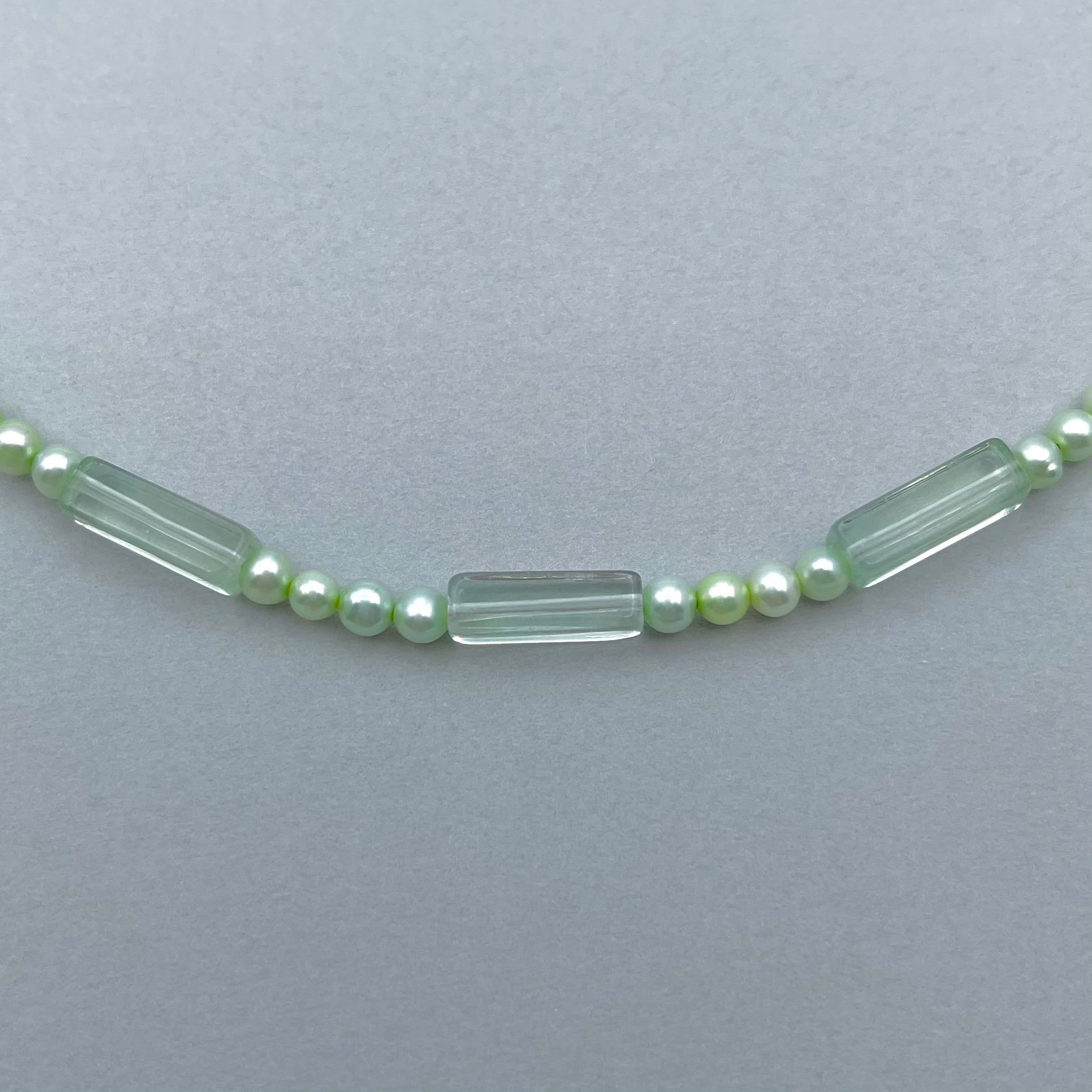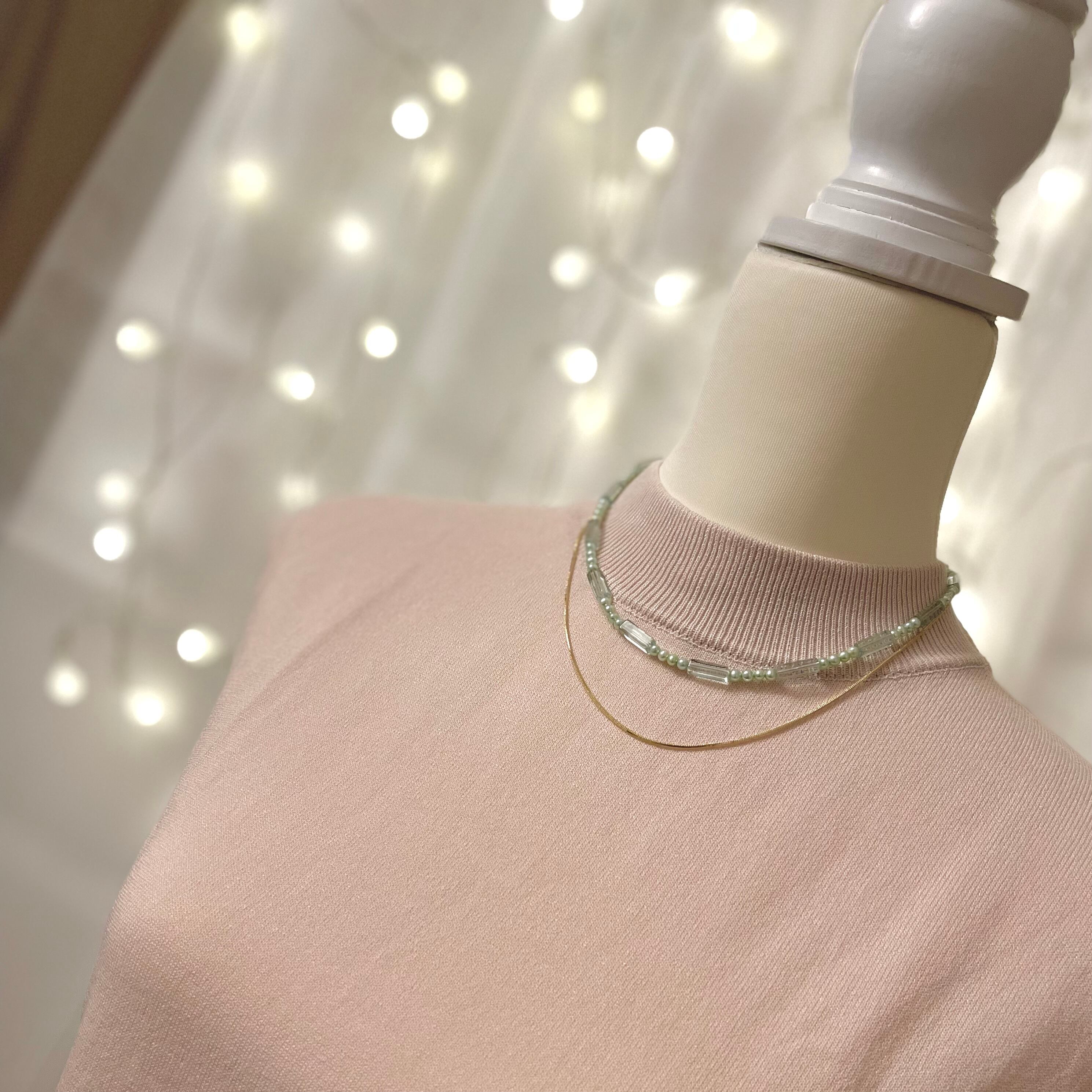 淡く透明感のあるグリーンフローライト。バランス良く配置されたパールの繊細な輝きが美しい組み合わせとなり、エレガントでユニークなデザインとなっています。おしゃれなコーディネートを演出してくれますので、日常の中でも特別な場にも、素敵に輝いてくれるアクセサリーです。